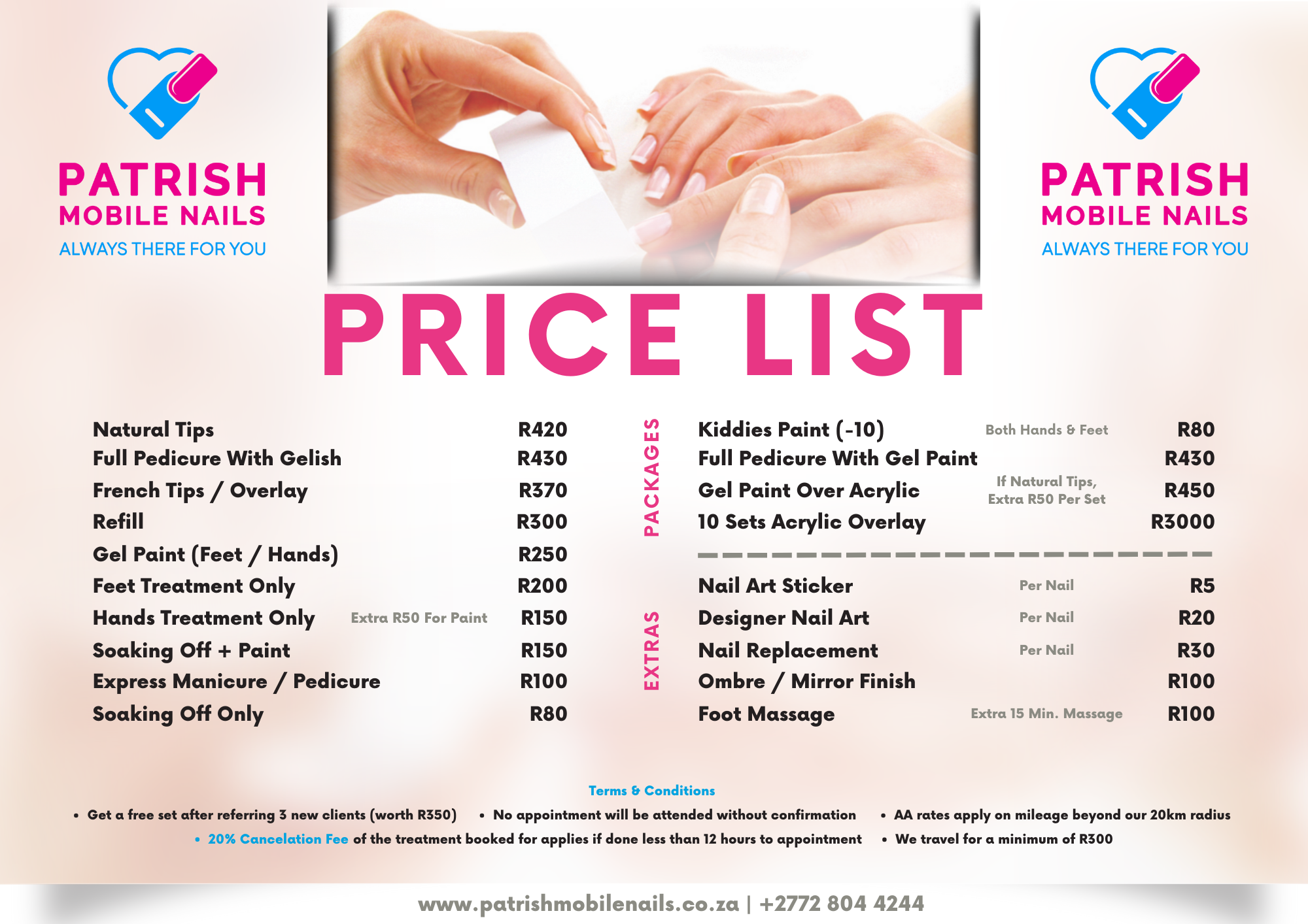 Our Pricelist Full Pedicure + Gelish R430 Natural Tips R420 French Tips / Overlay R370 Refill R300 Gel Paint (Feet / Hands) R250 Feet Treatment (Only) R200 Hands Treatment Only R150 Soaking Off + Paint R150 Express Manicure / Pedicure R100 Soaking Off (Only) R80 Our Packages Kiddies Paint (-10)Both Hands & Feet R80 Full PedicureWith Gel Paint R430 Gel Paint Over AcrylicIf Natural Tips, Extra R50 R450 10 SetsAcrylic Overlay R3000 Our Extras Nail Art StickerPer Nail R5 Designer Nail ArtPer Nail R20 Nail ReplacementPer Nail R30 Ombre/ Mirror Finish R100 Foot MassageExtra 15 Min Massage R100 Terms & CONDITIONS Get a free set (Worth R350), after referring 3 new clients. Book Your Treatment Download Pricelist